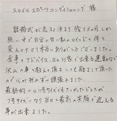 結婚式が急きょ決まり残り3カ月しか無い中で自分に甘い私のマインドと体を変えて下さり本当にありがとうございました。